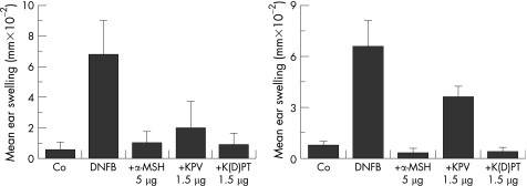 The graph shows that both α‑MSH (5 µg) and KPV (1.5 µg) significantly reduce ear swelling induced by DNFB at 24 hours and 2 weeks compared to DNFB alone, with α‑MSH exhibiting slightly greater suppression at the 2‑week timepoint. Co-treatment with the control peptide K(D)PT has minimal effect, confirming the specificity of the anti-inflammatory response.